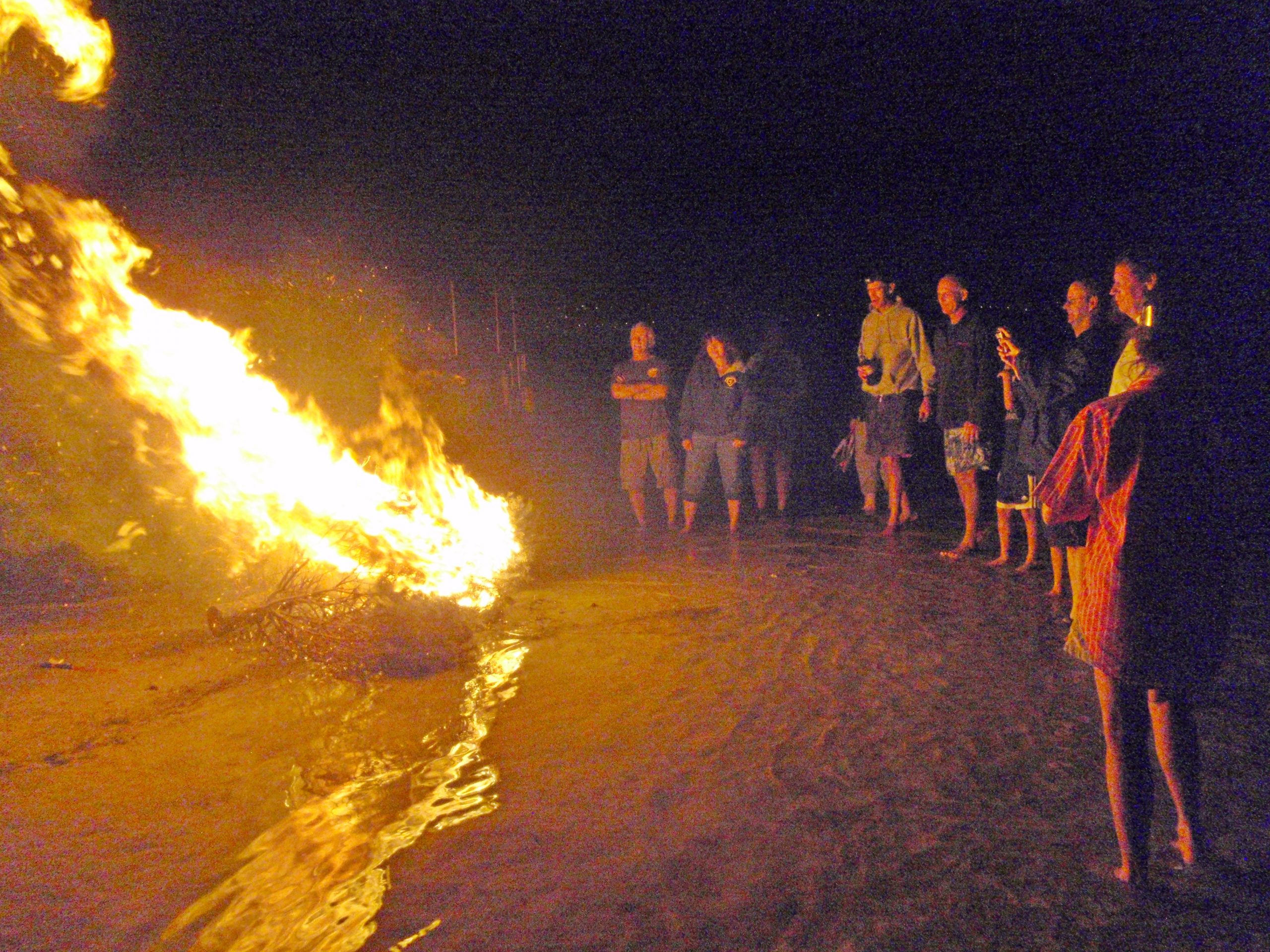 Bei Flut ist die ganze Sandinsel ca. 20cm unter Wasser, bei Ebbe guckt sie ca 20cm raus. Auf diesem unsicheren Fleckchen Erde wurde Sylvester dann auch um 22.00h gefeiert (Tidenbedingt). Die anderen Segler aus dem Yachtclub waren schon da und haben die Weihnachtsbäume zum traditionellen Christmastree-burning gestapelt. Nach meheren Anläufen hats dann gebrannt und wir hatten im wahrsten Sinne des Wortes Smoke on the water.
